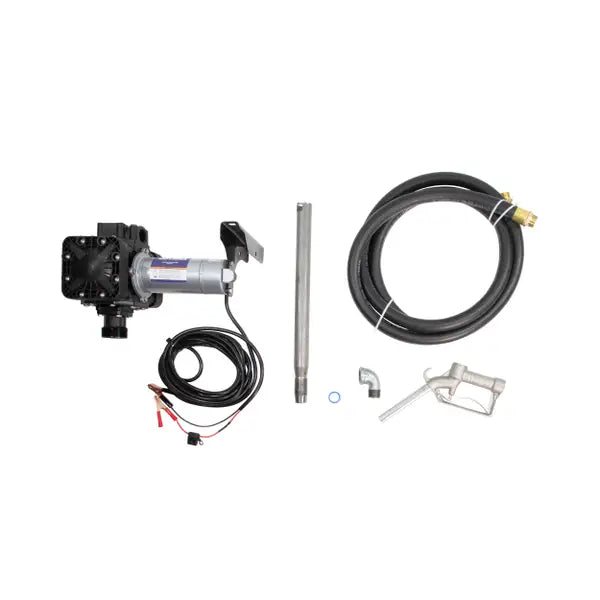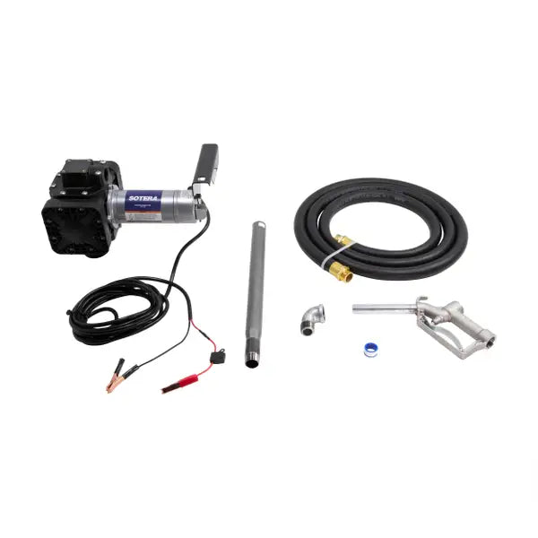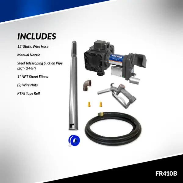 El modelo FR410B es un sistema de transferencia de productos químicos de 12 VCC. Este paquete Sotera incluye un soporte de tapón de metal, un tubo de succión de polipropileno y accesorios químicos adicionales.