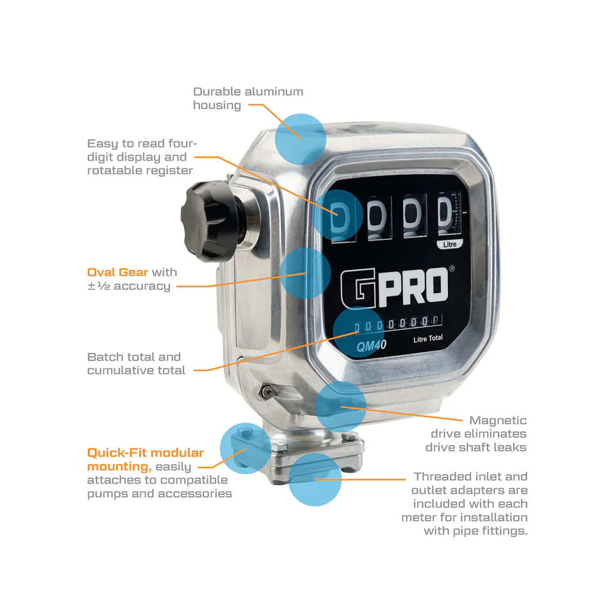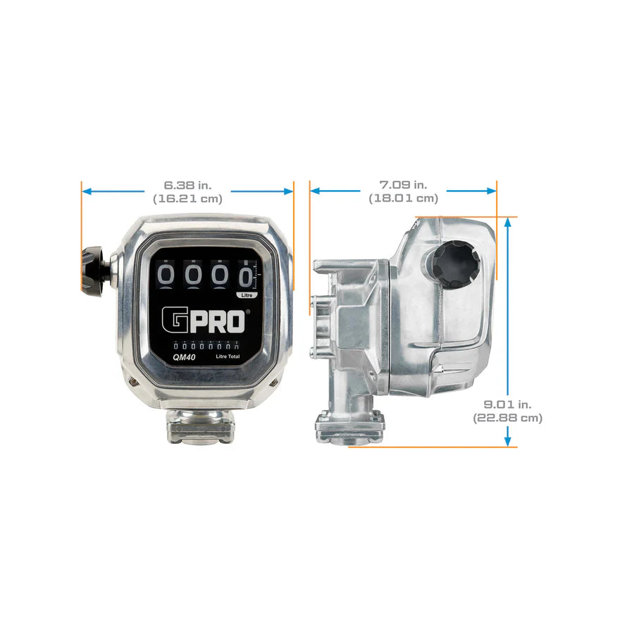 El medidor de combustible mecánico GPRO QM40 proporciona mediciones precisas de combustible para obtener lecturas más exactas en operaciones de flotas, equipos pesados y aplicaciones agrícolas. Cuenta con un mecanismo de accionamiento magnético prácticamente sin fricción; una menor fricción se traduce en un mayor flujo, capaz de manejar caudales de hasta 150 LPM. El QM40 está equipado con conexiones NPT y de brida, lo que permite su instalación en todas las salidas de bomba roscadas o productos modulares GPI.